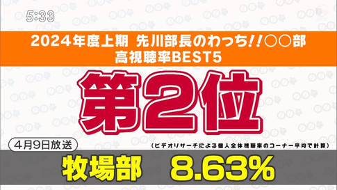この中で4月9日に放送された東北牧場の「牧場部」が視聴率8.63%で、堂々の2位にランクインしました。